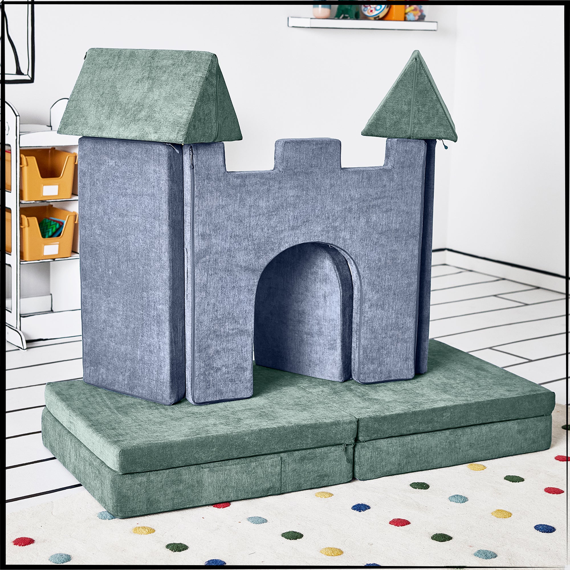 Build upon the fantasy with this complementary play set. A chiseled castle with turrets and a sturdy drawbridge bring the adventures to towering new heights. Both pieces are made with highly durable support foam and machine washable zip covers, so the story continues for ages to come. Pairs well with the Yourigami Play Couch for bigger, better fun!